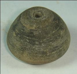 | Description / विवरण | Perforated terracotta bead, betel nut in shape, depression at the base, surface is smooth, clay incrustation all over. |