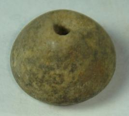 | Description / विवरण | Plain perforated terracotta bead, betel nut in shape, flaked off at the tip. |