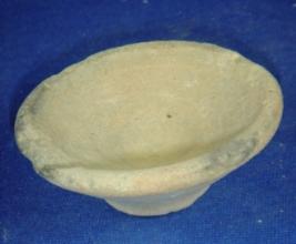 | Description / विवरण | Coarse fabric, ill fired, crudely finished, earthen lamp with broken rim, flayed body and round flat base with string marks. Earthly incrustation all over. |