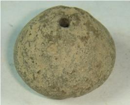 | Description / विवरण | Perforated terracotta bead, betel nut in shape, base is flat, surface is rough, clay incrustation all over. |