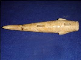 | Description / विवरण | Bone container in the shape of fish to store toilet object, probably vermilion. The body of the fish is designed with incised lines and dots. The body has beautiful tail, fins, round body and eyes. |