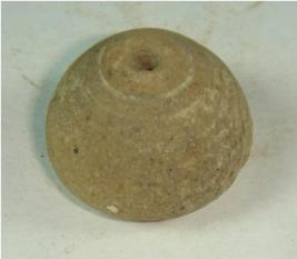 | Description / विवरण | Perforated terracotta bead, betel nut in shape, depression at the base, surface is rough. Clay incrustation all over. |