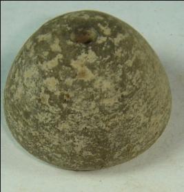 | Description / विवरण | Perforated terracotta bead, betel nut in shape, base is flat surface is smooth, clay incrustation all over. |