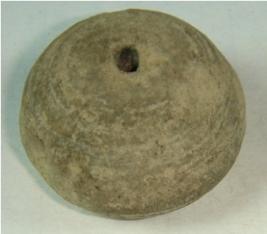 | Description / विवरण | Perforated terracotta bead, betel nut shape, deep depression at the base, surface is rough, clay incrustation all over. |