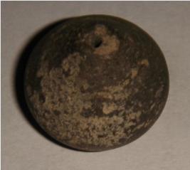 | Description / विवरण | Perforated terracotta bead, betel nut in shape, smooth in surface, slight depression at the base, surface is chipping off. |