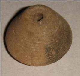 | Description / विवरण | Perforated terracotta bead, betel nut in shape, base is flat, surface is smooth but clay incrustation all over. |