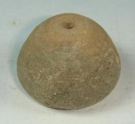 | Description / विवरण | Plain, perforated terracotta bead, betel nut shape. The tip is slightly flat and the base has slight depression in the centre. |