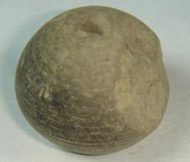 | Description / विवरण | Pot shaped perforated terracotta bead, with mild striation marks and slightly deep depression at the base. Part of the body is broken. |