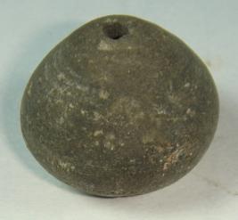 | Description / विवरण | Perforated terracotta bead, betel nut in shape, and lower body has mild striation marks and the base has a depression. |