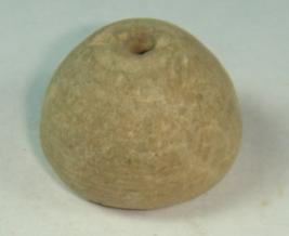| Description / विवरण | Small, perforated terracotta bead, betel nut in shape. The body has mild concentric circles. |