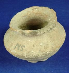 | Description / विवरण | Coarse, ill fired, tiny terracotta Miniature pot with round flat base, carinated body, broad mouth and averted rim which is partially flaked off. |