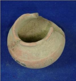 | Description / विवरण | Semi fine, well fired tiny terracotta Miniature pot with oval base, round body, upper part of which in party broken and slightly raised rim with concavity below. Carnation mark is seen on the waist of the body. It was broken into pieces but restored later. |