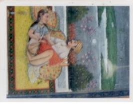 | Description / विवरण | The painting depicts a young couple, having sex on a raised platform upon which a yellow carpet made in floral design in these. In background, there are trees, floral plants, river in gray colour, green field and gray, black colour sky with full moon. |