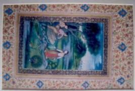 | Description / विवरण | Two ladies are sitting under a tree on a rock and a another lady is going to river. Three peacocks are moving in a garden. A temple can be seen above. |