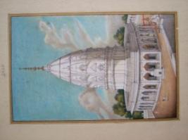 | Description / विवरण | It is Kalka Ji temple in Delhi and painted as manuscripts. Entire temple painted in white color. In background light pink colour is printed. A number of arch can be seen. |