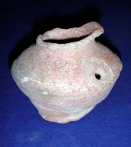 | Description / विवरण | Ill fired, tiny terracotta spouted jar with flat, circular base, carinated body, narrow mouth and averted rim which is almost broken. Two perforated holes are seen on the body and the base respectively. |