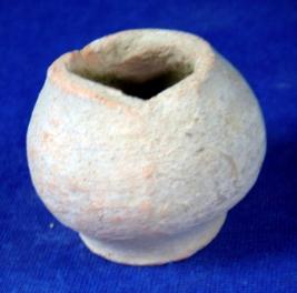 | Description / विवरण | Tiny terracotta jar, with flat, circular base, bulbous body and featureless rim, which is slightly flaked off. |