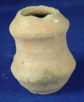 | Description / विवरण | Glazed, semi fine, tiny terracotta jar, with flat, circular base, double lota body, which is slightly curved at the centre. The rim is broken and it has broad mouth. The body is slightly flaked off. |