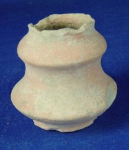 | Description / विवरण | Semi fine, well made tiny terracotta jar, with flat, circular base and body carinated at the lower part, and curved at the centre. The upper part of the body is also carinated, but this carination is smaller than the lower carination. It has broad mouth, with broken rim. The lower carination is slightly flaked off. |