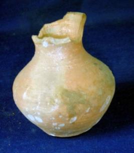 | Description / विवरण | Glazed, semi fine tiny terracotta pitcher, with, flat, circular base, bulbous body, low neck, narrow flayed mouth and averted rim, which is almost broken. A mild carination mark is visible on the body. |