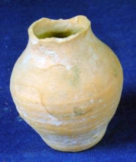 | Description / विवरण | Semi fine, ill fired, tiny terracotta jar, with flat, circular base, bulbous body, narrow mouth and featureless rim which is slightly flaked off. Close striation marks are visible on the body. |