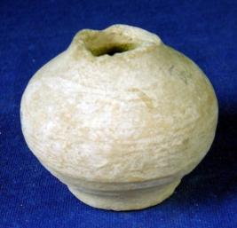 | Description / विवरण | Coarse, tiny terracotta jar with flat, circular base, bulbous body and narrow neck with broken rim. Clay incrustation is visible all over the body. |
