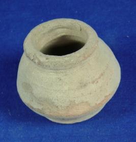 | Description / विवरण | Coarse, incrustation tiny terracotta jar with circular flat base, carinated body, narrow mouth and rim with concavity below. Sparse striation marks are visible on the body. |