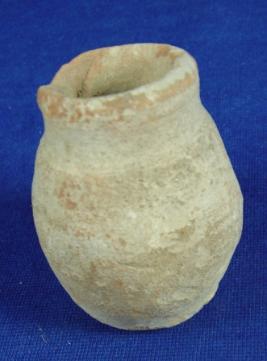 | Description / विवरण | Coarse, well fired tiny terracotta jar with round and flat base, bulbous body, narrow and low neck with featureless rim which is slightly flaked off. |