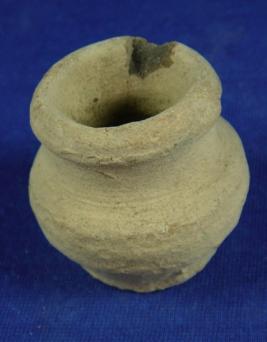 | Description / विवरण | Ill fired terracotta tiny jar, flat and round base the body is bulbous, the rim is broad and averted. Clay incrustation all over. |