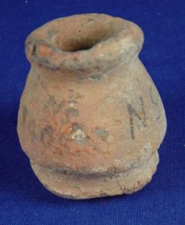 | Description / विवरण | Coarse, ill fired terracotta tiny jar, with flat and round base, carinated bottom, its body is bulbous, rim is broad and averted. |