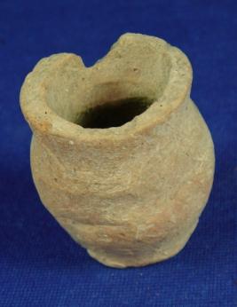 | Description / विवरण | Terracotta tiny jar, flat and round base, the body is irregular, body is bulbous rim is broad and averted. It is ill fired. |