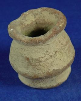 | Description / विवरण | Coarse, ill fired terracotta tiny jar, flat and round base, carinated bottom, its body is bulbous, rim is broad and averted. |