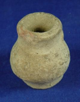 | Description / विवरण | Terracotta vessel - tiny jar, it has flat round base, sparse striation marks on the middle part. The mouth is broad and rim is averted. The fabric is coarse. clay incrustation all over the body. |