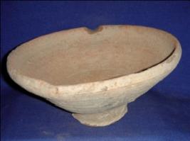 | Description / विवरण | Terracotta bowl, with a broad mouth thick rim and a narrow, flat base, without any decoration. The wheel marks are visible. It was probably used as a utensil. The outer side is black. |