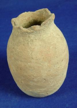 | Description / विवरण | Coarse terracotta tiny jar, having flat base, bulbous body broken neck and rim. Close striation marks are on the exterior and sparse striation marks in the interior. |