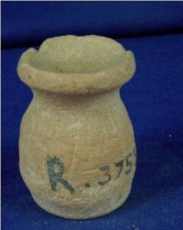 | Description / विवरण | Terracotta tiny jar having narrow neck, broad mouth and thick rim, bulbous body and flat oval base. Incised line designs on it, vertically and horizontally. |