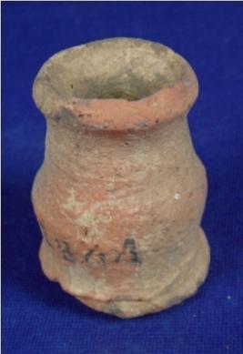 | Description / विवरण | Coarse, ill fired terracotta tiny jar with broad mouth, averted rim short neck bulbous body with striation marks in the middle part and flat circular base. |