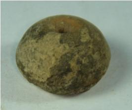 | Description / विवरण | Perforated terracotta bead, ill fired betel nut in shape with flat base flaking of base due to weathering effect. |
