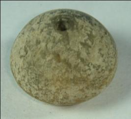 | Description / विवरण | Perforated terracotta material, ill fired coarse betel nut in shape, with depression at base, striation marks on body and base. |