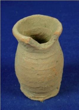 | Description / विवरण | Coarse terracotta vessel - tiny jar, with broad mouth, featureless rim with concavity, below, slightly round body and broad, circular, flat base. The body has sparse striation marks. The rim is broken at one side. |