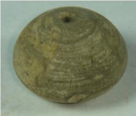 | Description / विवरण | Perforated terracotta bead, betel nut in shape, depression at the base, surface is smooth. Clay incrustation all over. |