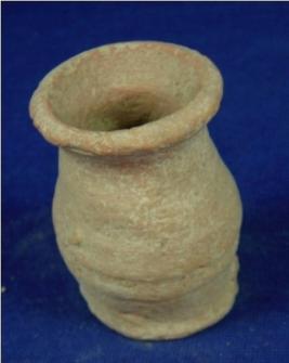 | Description / विवरण | Coarse terracotta vessel - tiny jar with flat circular base, cylindrical body, low neck and a wide open mouth. The rim is thick and out curved. |