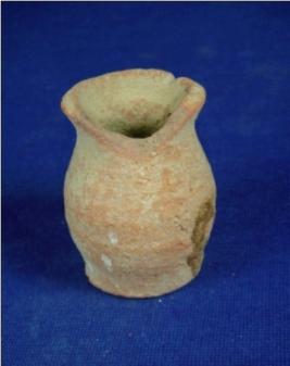 | Description / विवरण | Coarse terracotta tiny jar with averted rim, cylindrical body and circular flat footed base. |
