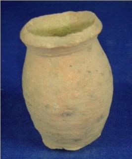 | Description / विवरण | Coarse terracotta tiny jar with averted rim, narrow neck, bulbous body and flat circular footed base, the striation marks are prominent on the body. |