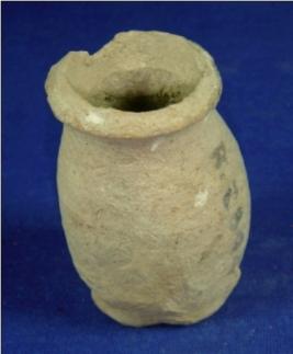 | Description / विवरण | Coarse terracotta tiny jar with slightly averted rim, narrow neck, bulbous body and flat circular footed base. A part of the rim is broken. |