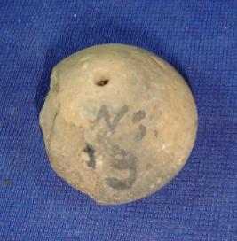 | Description / विवरण | Terracotta bead betel nut shape with a perforated hole in the centre. It is broken from one side. |