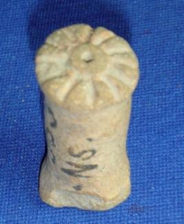 | Description / विवरण | Terracotta bead, cylindrical in shape, with incised line designed top and base. |