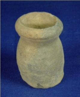 | Description / विवरण | Coarse terracotta vessel - tiny jar with inverted rim, narrow neck, cylindrical body and flat-circular footed base, striation marks are prominent on the body. |
