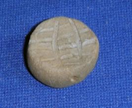 | Description / विवरण | Terracotta bead, flat and circular in shape, both surfaces have slight depression, with incised line designs. |