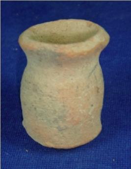 | Description / विवरण | Coarse terracotta vessel - a tiny jar, with broad mouth, inverted rim with concavity below, cylindrical body and broad flat and circular base. The base is crudely cut. |